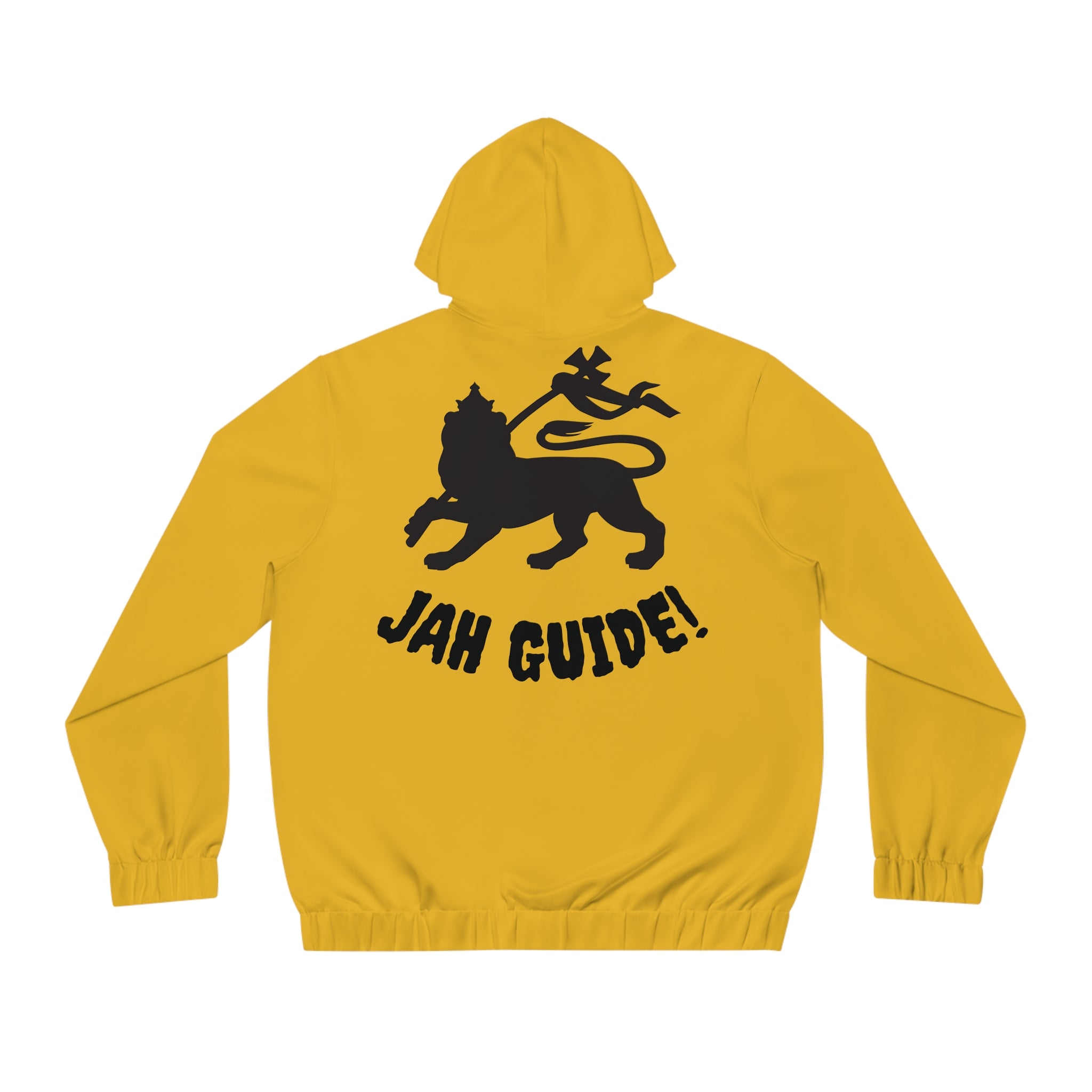 Rasta Lion Full-Zip Hoodie — 'Jah Guide!' Yellow Zip-Up with Red, Gold & Green Stripes